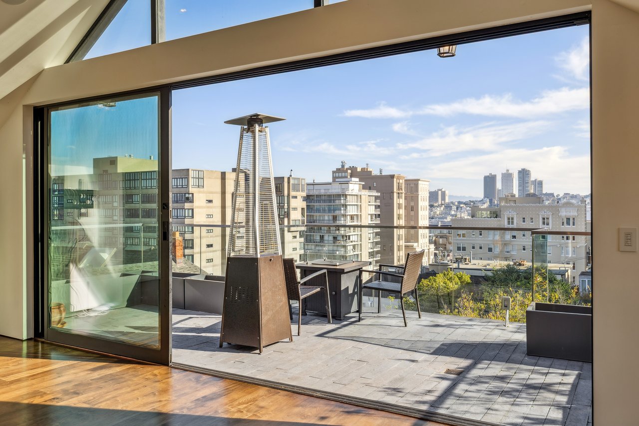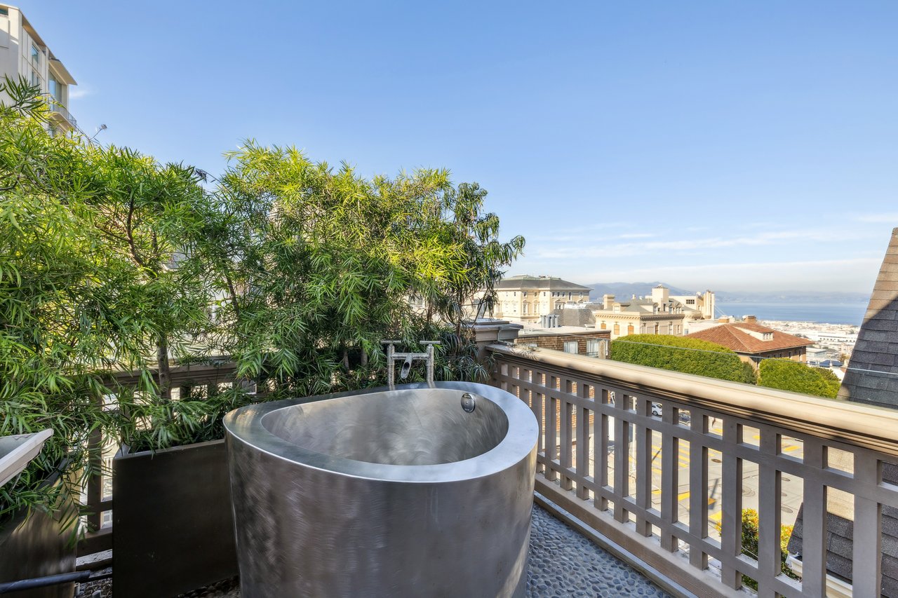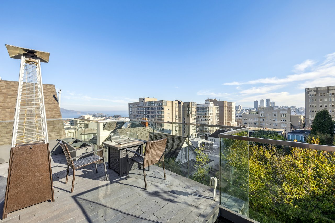 Designed for seamless indoor–outdoor living, this beautifully renovated two-level Pacific Heights penthouse offers multiple private outdoor spaces and sweeping city and bay views. A gracious entry showcases custom built-ins and leads to a sun-filled bathroom with bespoke tilework and a walk-in rainfall and steam shower, thoughtfully positioned between an executive office and a generous bedroom. The upper level is an entertainer’s dream, defined by soaring vaulted ceilings and an open-concept living, dining, and kitchen area that flows effortlessly onto two decks. Large sliding glass doors open the living room to a spacious deck with a fire pit and breathtaking views of the city, the Bay, and Alcatraz. The chef’s kitchen anchors the space and opens directly to an additional deck equipped with a gas grill, while featuring a six-burner Wolf range, a Miele dishwasher, a Sub-Zero refrigerator, wine refrigeration, and an oversized island ideal for gathering. The vaulted primary suite is a serene retreat, offering a private deck with an outdoor Japanese soaking tub and iconic Golden Gate Bridge views. The spa-like ensuite bath includes a deep soaking tub and a walk-in rainfall shower. Throughout the home, high-end finishes elevate the living experience, including radiant heated floors, a Lutron lighting system, and integrated speakers—creating a sophisticated residence where indoor and outdoor living blend effortlessly. Additional conveniences include a stacked in-unit washer and dryer and 10G Sonic Fiber.