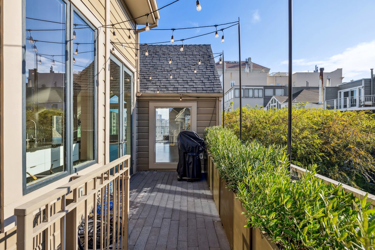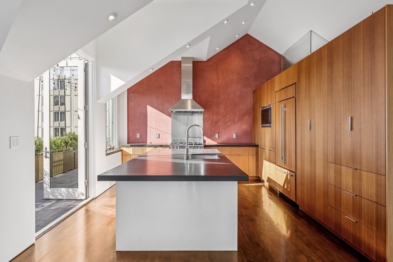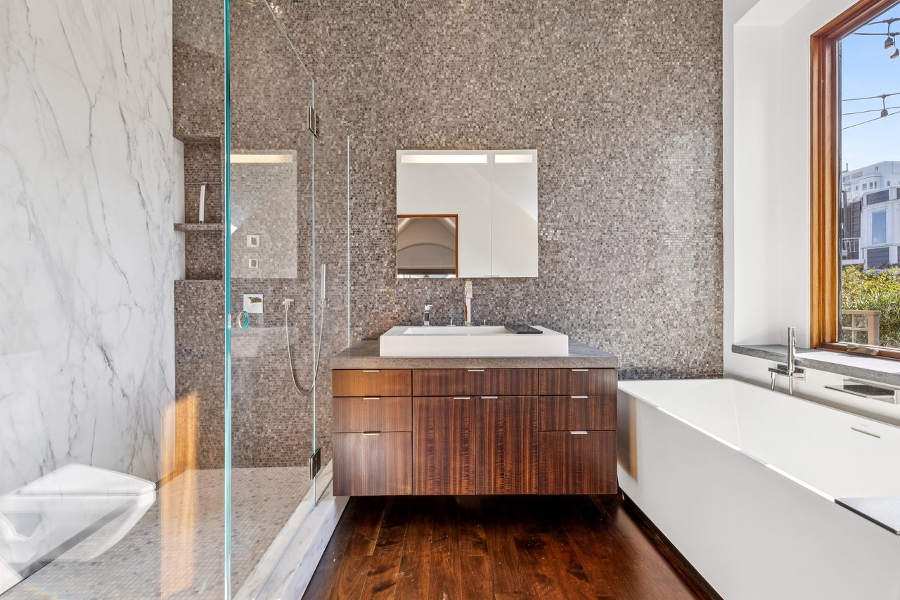 Designed for seamless indoor–outdoor living, this beautifully renovated two-level Pacific Heights penthouse offers multiple private outdoor spaces and sweeping city and bay views. A gracious entry showcases custom built-ins and leads to a sun-filled bathroom with bespoke tilework and a walk-in rainfall and steam shower, thoughtfully positioned between an executive office and a generous bedroom. The upper level is an entertainer’s dream, defined by soaring vaulted ceilings and an open-concept living, dining, and kitchen area that flows effortlessly onto two decks. Large sliding glass doors open the living room to a spacious deck with a fire pit and breathtaking views of the city, the Bay, and Alcatraz. The chef’s kitchen anchors the space and opens directly to an additional deck equipped with a gas grill, while featuring a six-burner Wolf range, a Miele dishwasher, a Sub-Zero refrigerator, wine refrigeration, and an oversized island ideal for gathering. The vaulted primary suite is a serene retreat, offering a private deck with an outdoor Japanese soaking tub and iconic Golden Gate Bridge views. The spa-like ensuite bath includes a deep soaking tub and a walk-in rainfall shower. Throughout the home, high-end finishes elevate the living experience, including radiant heated floors, a Lutron lighting system, and integrated speakers—creating a sophisticated residence where indoor and outdoor living blend effortlessly. Additional conveniences include a stacked in-unit washer and dryer and 10G Sonic Fiber.